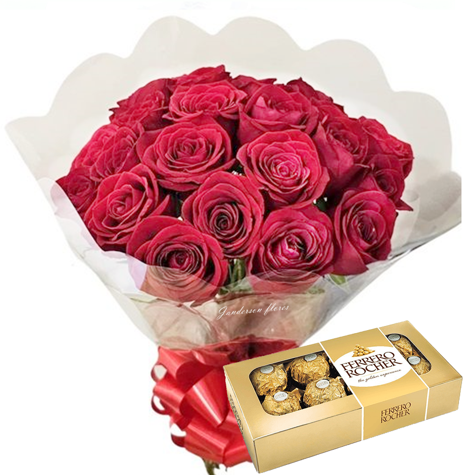 🌹 Buquê contendo 12 rosas vermelhas agrupadas e Ferrero rocher com 8 unidades. A imagem apresenta um produto apenas como referência. O produto real pode apresentar variações em forma/design e conforme a disponibilidade. As flores podem ser entregues em forma de botões ou semiflores. Buquê sem folhagens verdes. A embalagem é feita de celofane e possui um laço vermelho.