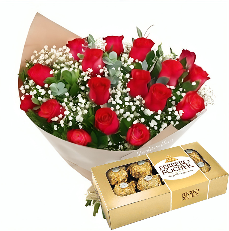 🌹 Buquê contendo 12 rosas vermelhas e ferrero rocher com 8 unidades. A imagem apresenta um produto apenas como referência. O produto real pode apresentar variações em forma/design e conforme a disponibilidade. As flores podem ser entregues em forma de botões ou semiflores. A embalagem é feita de kraft e possui um laço de rafia ou na falta será substituído por laço vermelho.