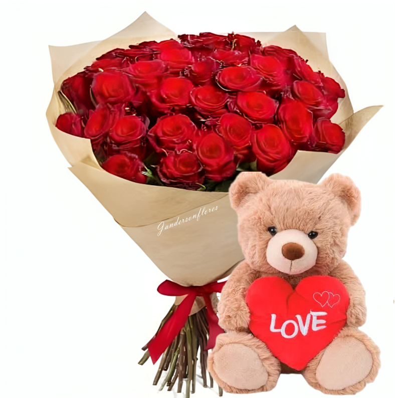 🌹 Buquê contendo 50 rosas vermelhas e ursinho de pelucia 30cm. A imagem apresenta um produto apenas como referência. O produto real pode apresentar variações em forma/design e conforme a disponibilidade. As flores podem ser entregues em forma de botões ou semiflores. O modelo do urso pode variar de cor e modelo. A embalagem é feita de kraft e possui um laço de rafia ou na falta será substituído por laço vermelho.