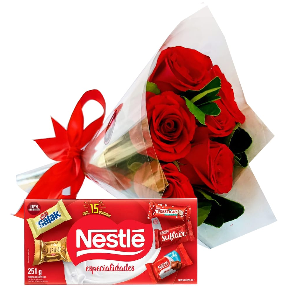 Buquê com 6 rosas vermelhas e cx de bombom. A imagem apresenta um produto apenas como referência. O produto real pode apresentar variações em forma/design e conforme a disponibilidade. As flores podem ser entregues em forma de botões ou semiflores. A embalagem é feita de celofane transparente e possui um laço vermelho.