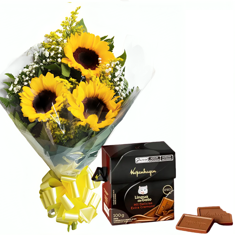 Arranjo com 3 girassóis + Mil Delícias Língua De Gato Extra Cremoso 100g . A imagem apresenta um produto apenas como referência. O produto real pode apresentar variações em forma/design e conforme a disponibilidade. O Tamanho dos girassóis pode variar. A embalagem do arranjo é feita de celofane e possui um laço.