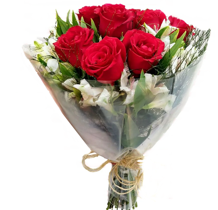 Buquê com 12 rosas vermelhas e astromélias. A imagem apresenta um produto apenas como referência. O produto real pode apresentar variações em forma/design e conforme a disponibilidade. As flores podem ser entregues em forma de botões ou semiflores. Na falta da astromélias brancas será substituído por outra cor disponível no dia.