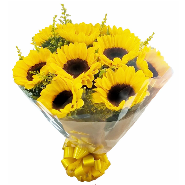 Buquê contendo 10 girassóis. A imagem apresenta um produto apenas como referência. O produto real pode apresentar variações em forma/design e conforme a disponibilidade. O Tamanho dos girassóis pode variar. A embalagem é feita de celofane e possui um laço.
