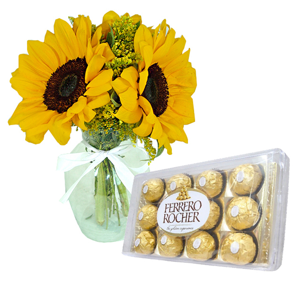3 Girassóis no jarro pequeno e ferrero rocher com 12 unidades. A imagem apresenta um produto apenas como referência. O produto real pode apresentar variações em forma/design e conforme a disponibilidade. O Tamanho dos girassois pode variar de tamanho. O Jarro é pequeno aprox. 25cm e o modelo pode variar dependendo do modelo disponível em estoque.