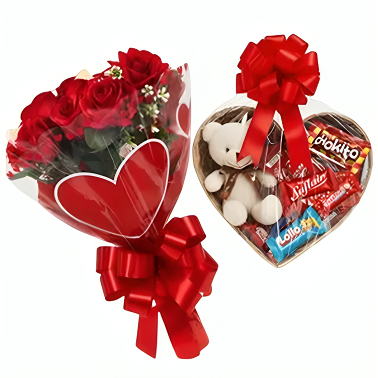 Buquê contendo 12 rosas vermelhas nacionais e coração com 7 bombons sortidos e pelucia 12cm na embalagem coração. A imagem apresenta um produto apenas como referência. O produto real pode apresentar variações em forma/design e conforme a disponibilidade. O modelo do ursinho pode variar de cor e modelo. As flores podem ser entregues em forma de botões ou semiflores. A embalagem é feita de celofane transparente e o coração de plástico transparente.
