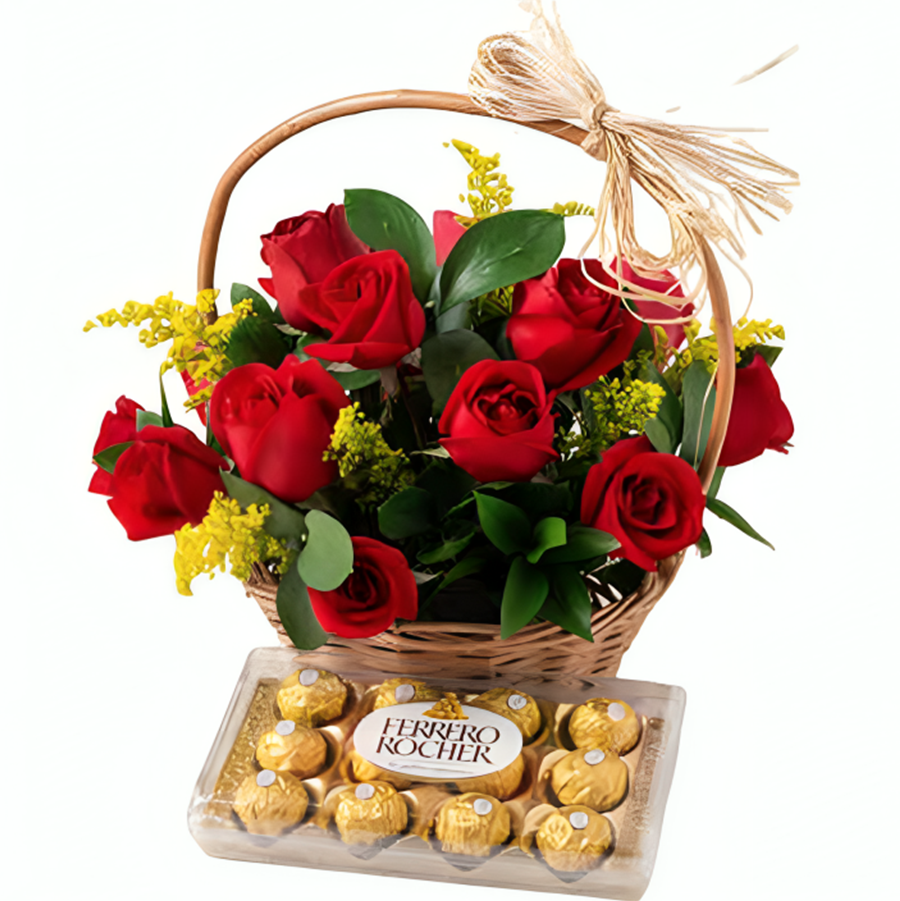 Cesta com 16 rosas vermelhas e Ferrero rocher com 12 unidades. A imagem apresenta um produto apenas como referência. O produto real pode apresentar variações em forma/design e conforme a disponibilidade. As flores podem ser entregues em forma de botões ou semiflores. A embalagem é feita de celofane e possui um laço vermelho.
