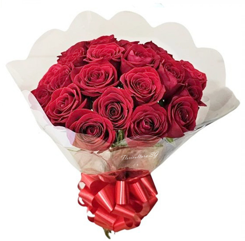 Buquê com 24 rosas vermelhas agrupadas. É um clássico atemporal que simboliza amor, elegância e sofisticação. A imagem apresenta um produto apenas como referência. O produto real pode apresentar variações em forma/design e conforme a disponibilidade. As flores podem ser entregues em forma de botões ou semiflores. Buquê sem folhagens verdes. A embalagem é feita de celofane de cor ou transparente e possui um laço vermelho. Tem 0,25 de largura e 0.35 de comprimento.