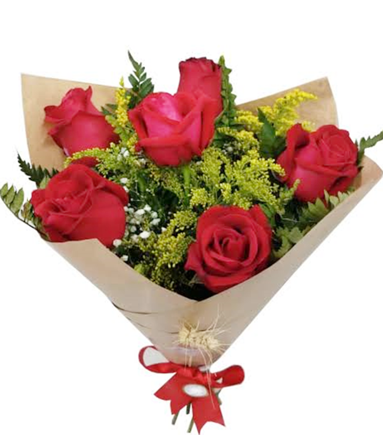 🌹 Buquê contendo 6 rosas vermelhas. A imagem apresenta um produto apenas como referência. O produto real pode apresentar variações em forma/design e conforme a disponibilidade. As flores podem ser entregues em forma de botões ou semiflores. A embalagem é feita de kraft e possui um laço de rafia ou na falta será substituído por laço vermelho.