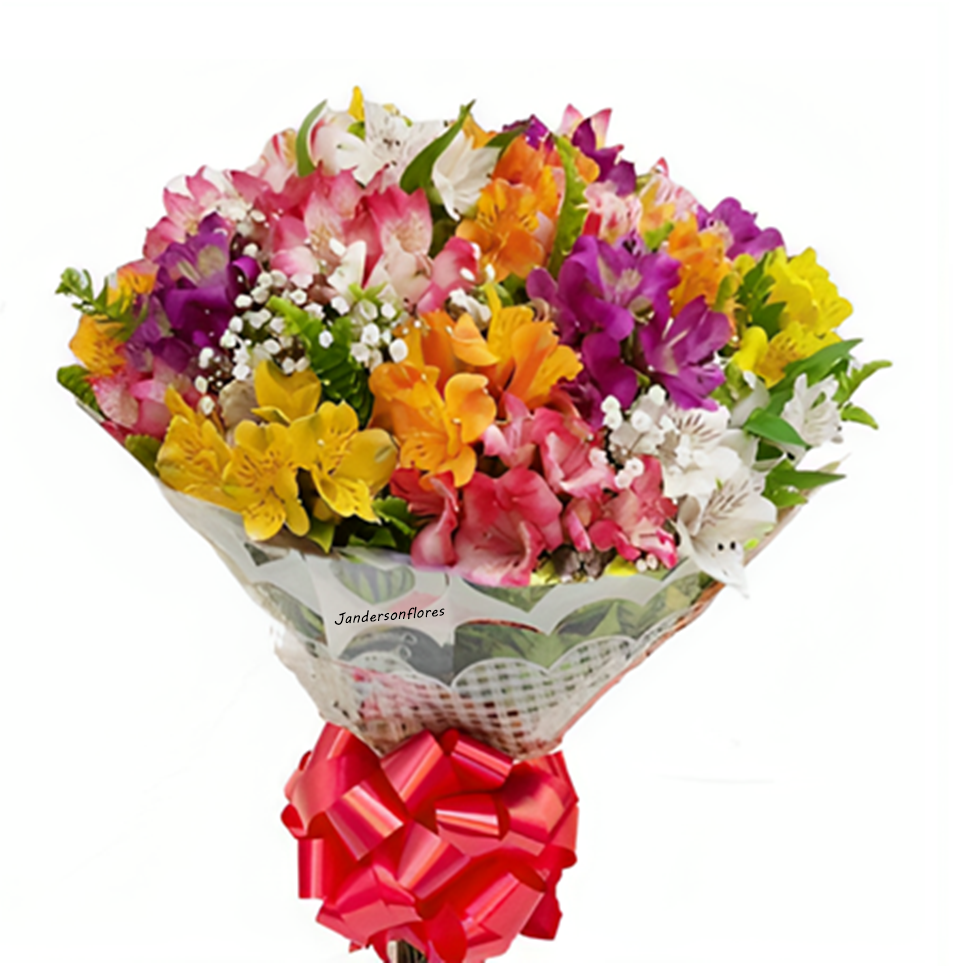 Buquê com astrmélias coloridas. A imagem apresenta um produto apenas como referência. O produto real pode apresentar variações em forma/design e conforme a disponibilidade. As cores das astromélias pode variar. A embalagem é feita de celofane e possui um laço vermelho.