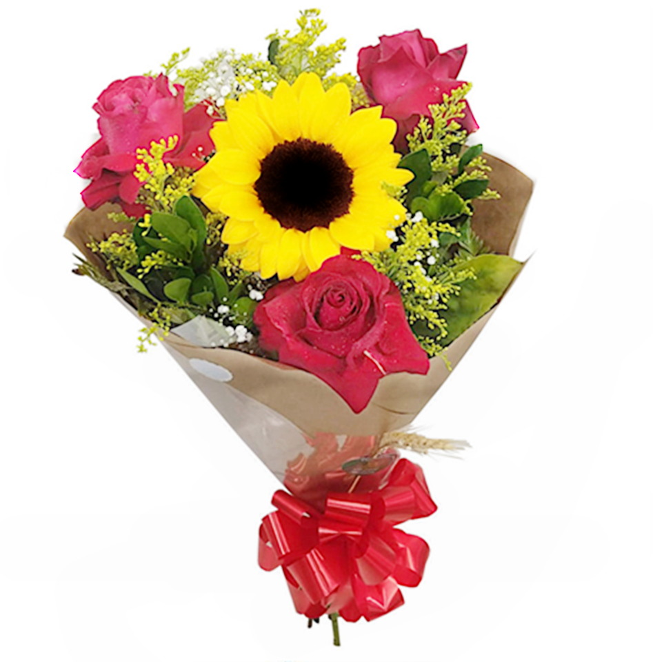 🌹 Buquê contendo 3 rosas vermelhas e 1 Girassol. A imagem apresenta um produto apenas como referência. O produto real pode apresentar variações em forma/design e conforme a disponibilidade. As flores podem ser entregues em forma de botões ou semiflores. A embalagem é kraft e possui um laço de rafia ou poderá ser substituído por laço vermelho.