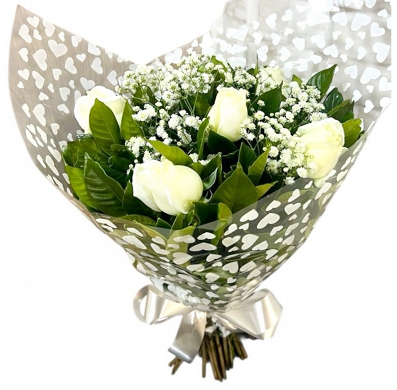 Buquê com 6 rosas brancas. A imagem apresenta um produto apenas como referência. O produto real pode apresentar variações em forma/design e conforme a disponibilidade. As flores podem ser entregues em forma de botões ou semiflores. A embalagem é feita de celofane e possui um laço.